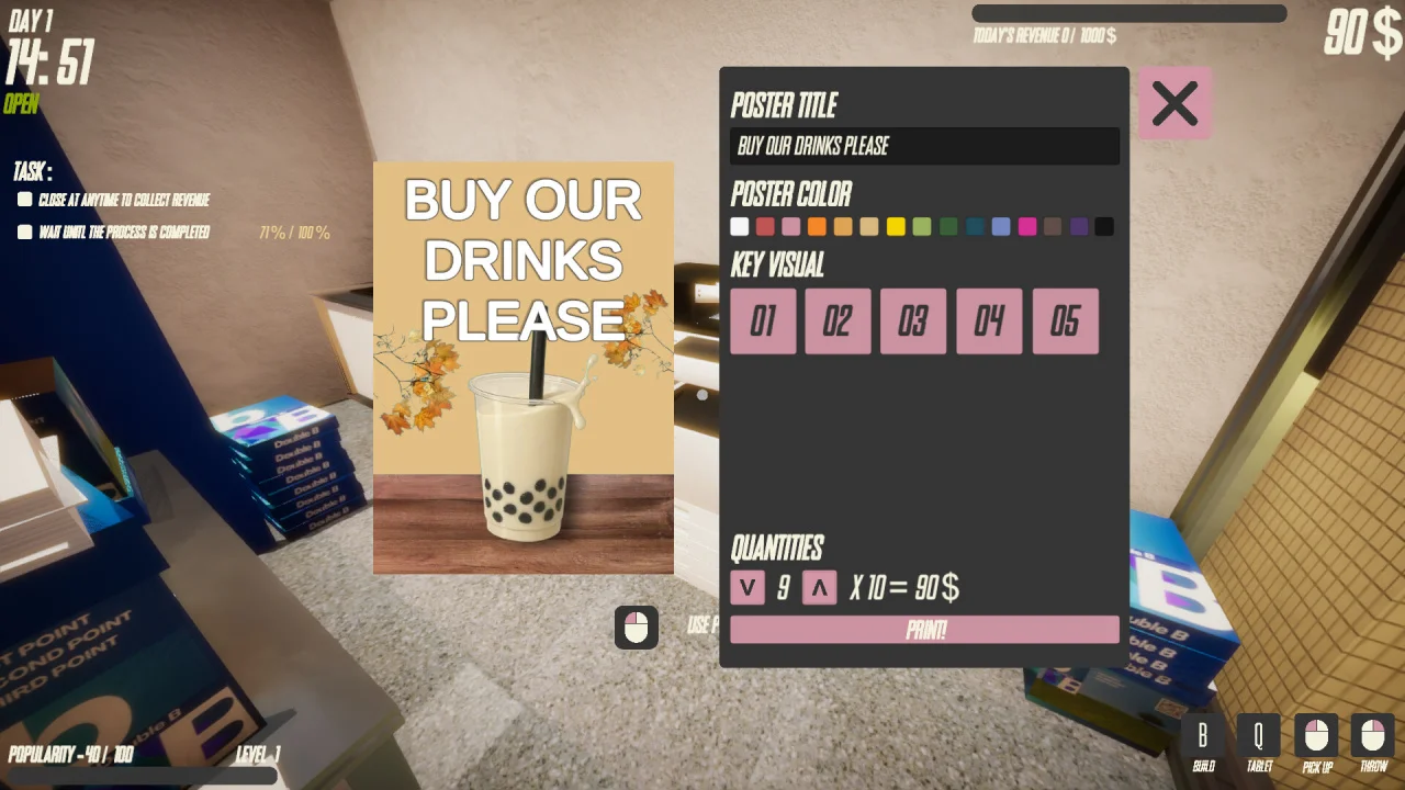 Boba Tea Shop Simulator — это увлекательная симуляционная игра, в которой вы становитесь владельцем собственной чайной с бобой и постепенно превращаете небольшой киоск в популярную точку притяжения. Игроку предстоит создавать напитки по рецептам или экспериментировать с ингредиентами, обслуживать клиентов с разными вкусами и характером, расширять меню и улучшать оборудование. В процессе вы управляете финансами, следите за уровнем удовлетворенности посетителей и развиваете бизнес, постепенно открывая новые возможности и декорируя пространство. С каждым уровнем появляются более требовательные заказчики, особые задания и события, которые требуют быстрой реакции и продуманного подхода. Игра создает уютную атмосферу благодаря плавному игровому циклу и возможности настроить свой стиль заведения, а динамичный прогресс делает процесс захватывающим как для любителей менеджмента, так и для поклонников спокойных экономических симуляторов.- ОС:Windows 7, 8, 10, 11 (64-bit)