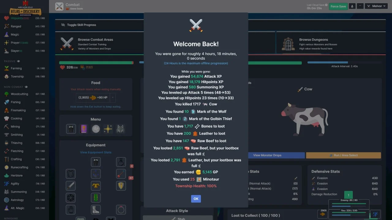 Melvor Idle — это глубокая idle-RPG, вдохновлённая классическими MMORPG, где весь игровой процесс построен вокруг прокачки навыков, управления ресурсами и долгосрочного планирования. Игра не требует постоянного внимания: действия выполняются автоматически, пока игрок занимается своими делами, но при этом каждое решение влияет на эффективность и прогресс. В Melvor Idle доступно множество навыков — боевые и небоевые, включая добычу ресурсов, крафт, готовку, рыбалку, кузнечное дело и магию. Боевая система основана на пошаговых сражениях с монстрами, подземельями и боссами, где важно правильно подобрать экипировку, заклинания и стиль боя. Экономика и развитие тесно связаны: добытые ресурсы используются для улучшения снаряжения, открытия нового контента и оптимизации прокачки. Игра поощряет стратегическое мышление, терпение и анализ, а минималистичный интерфейс делает упор на цифры, эффективность и рост показателей. Melvor Idle идеально подойдёт тем, кто любит ощущение постоянного прогресса без необходимости активного геймплея, предлагая сотни часов развития и оптимизации.- ОС:Windows 7, 8, 10 (64-bit)